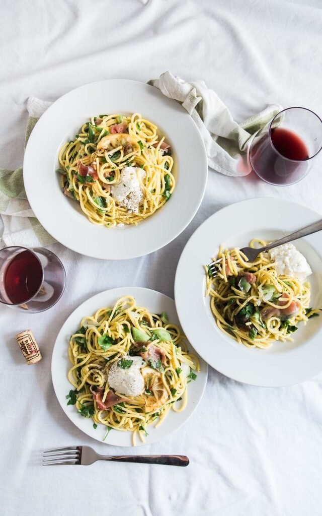 (tomato sauce, mozzarella, linguine)